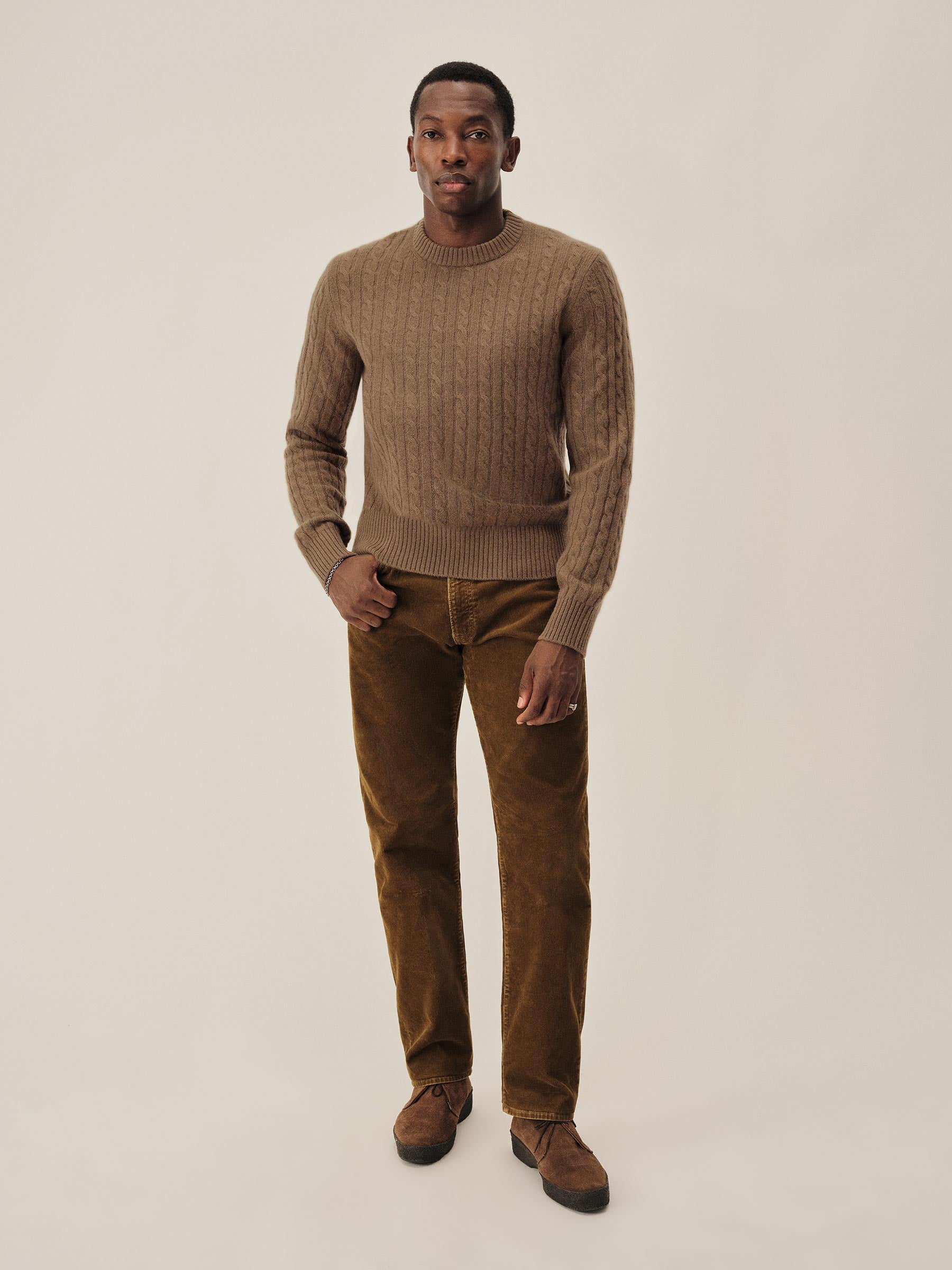 The California Cashmere Cable Crew is spun from 100% long-staple cashmere and knit in a refined 12-gauge cable pattern. Inspired by the casual poise of 1960s Ivy League sweaters, it’s finished with yarn-dyed ribbing at the neck, cuffs, and hem, and garment-rinsed for a soft, lived-in feel.