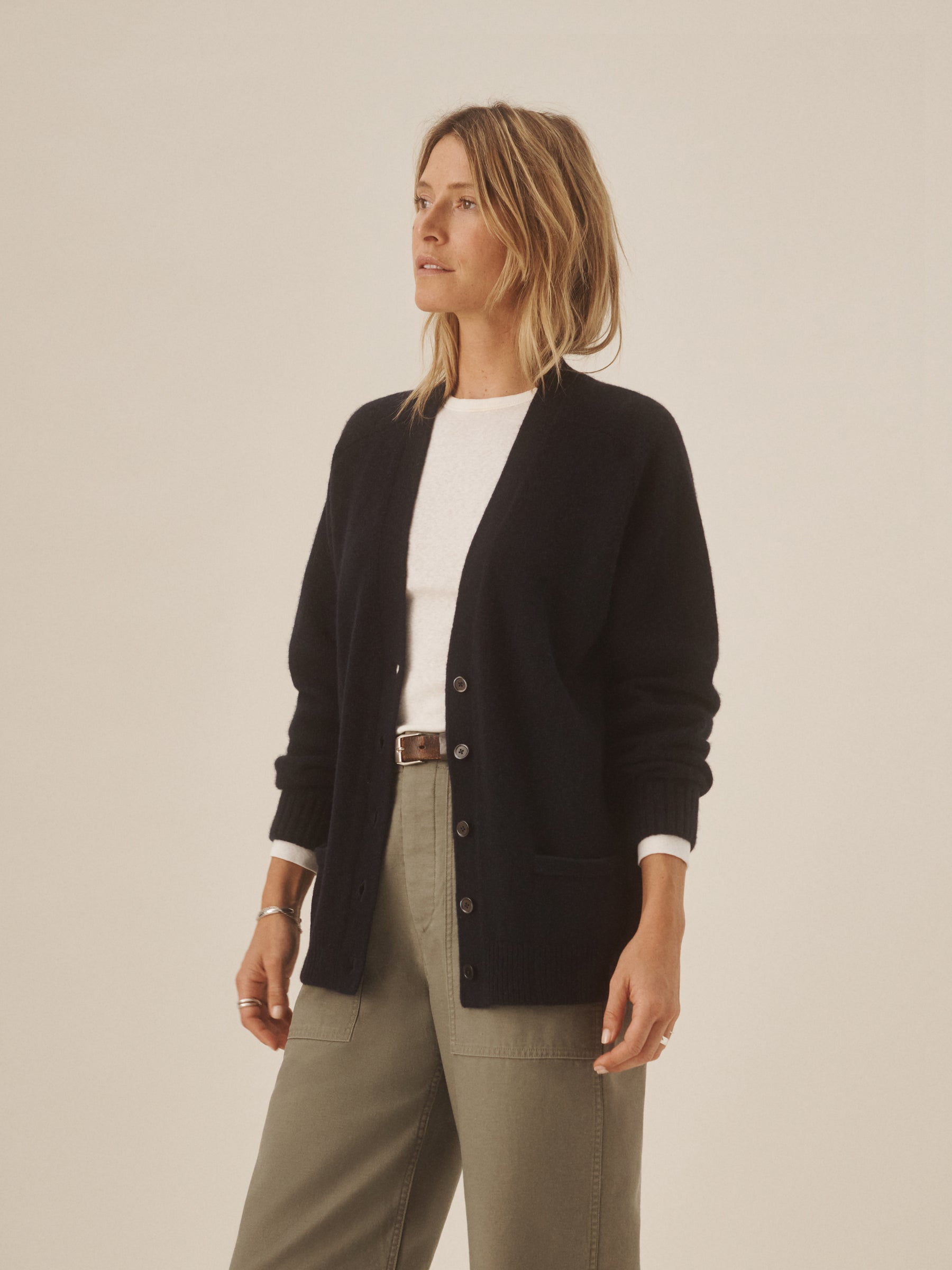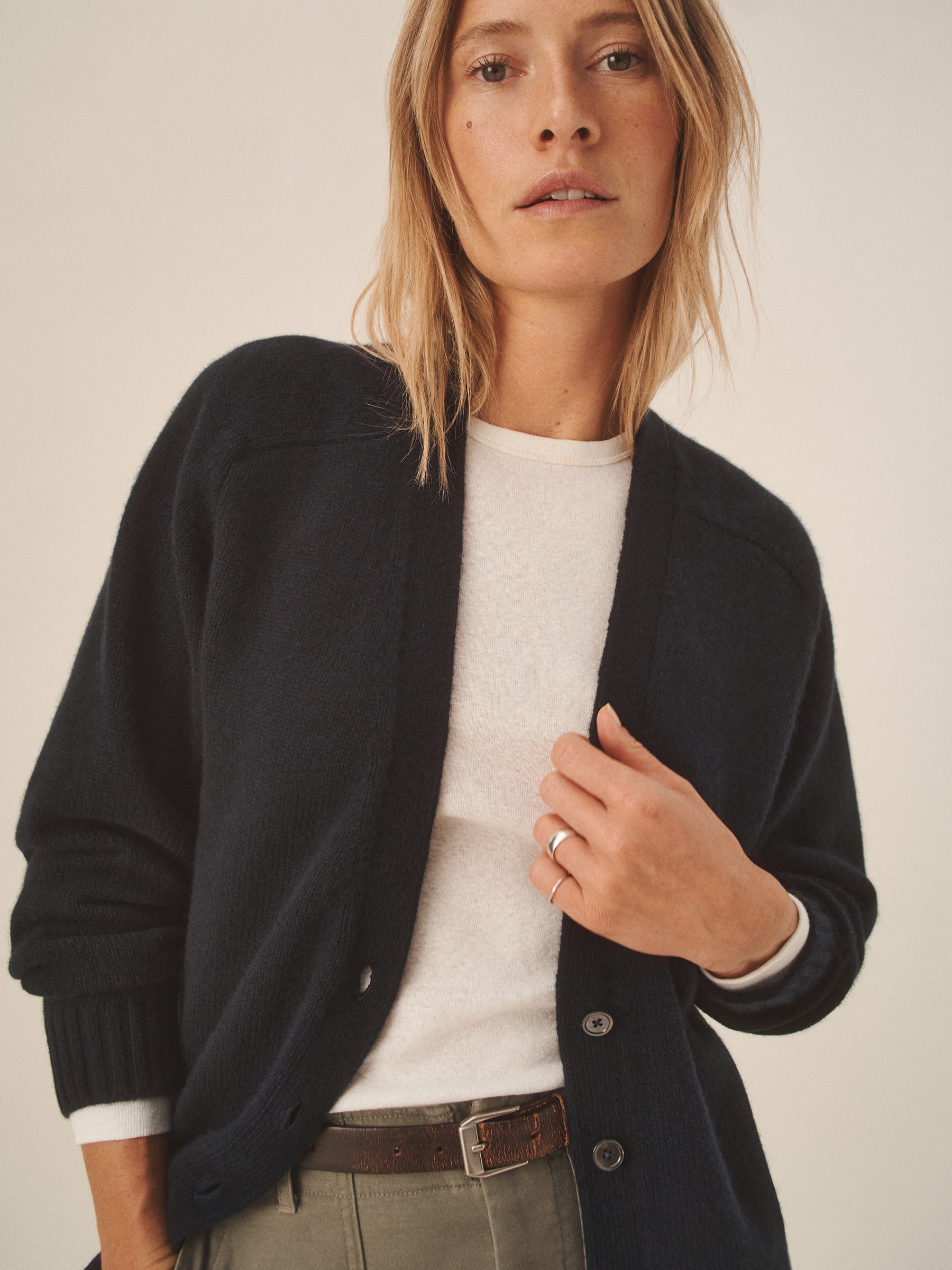 Inspired by vintage “grandfather” cardigans, a sweater made from 100% cashmere in a soft jersey stitch with natural drape and structure. Designed with an oversized fit and saddle armholes, it’s finished with rib trims at the cuffs and hem, functional buttons at the center front, and cleanly finished pockets.