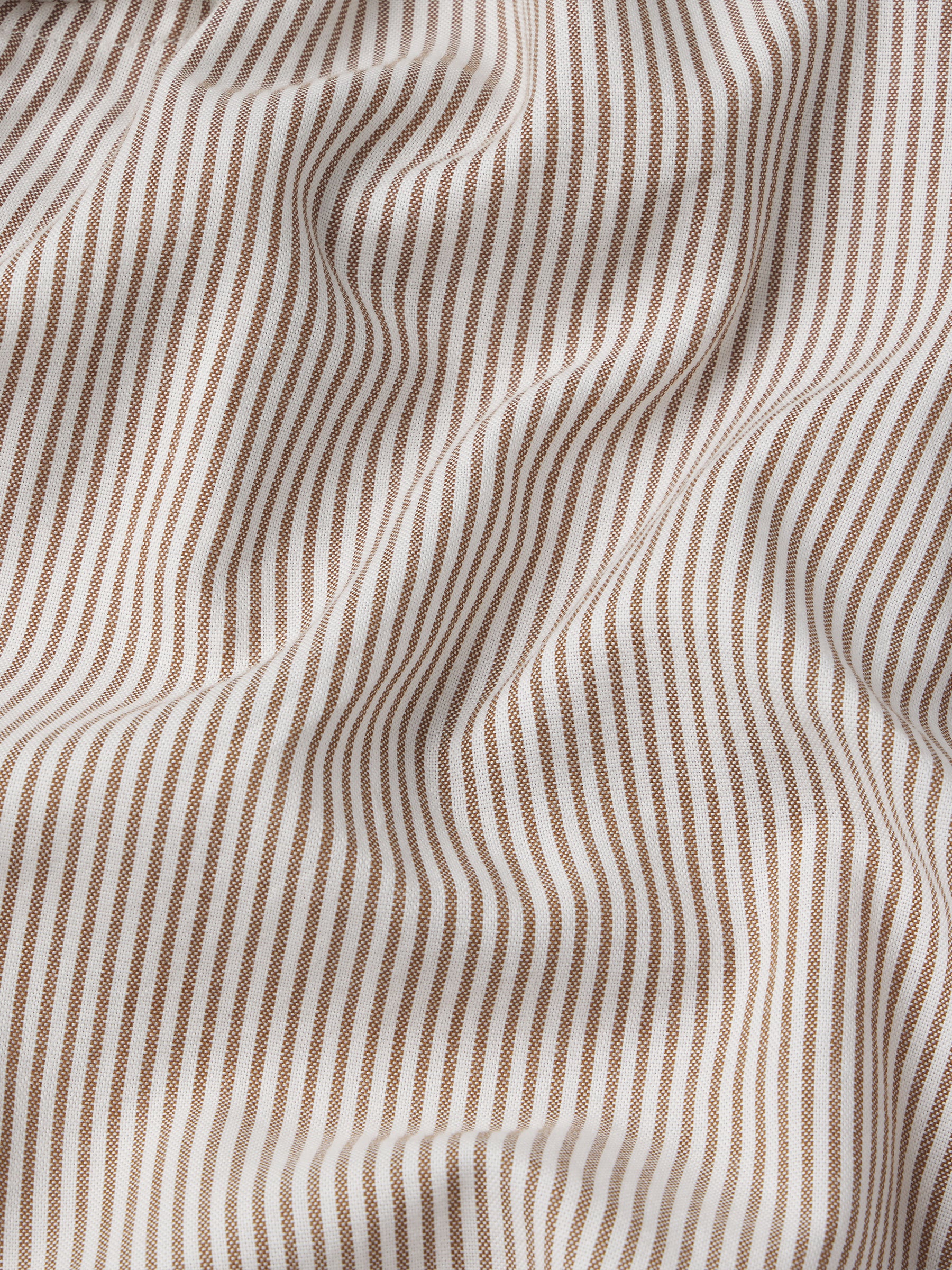 Inspired by 1950s men’s dress shirts, an Oxford cut from a natural, yarn-dyed fiber blend with a soft hand and crisp structure. Our slimmest shirt yet, it’s designed with a button-down collar that holds the perfect roll, stacked mother-of-pearl buttons, and felled seams for durability. Details include knife pleats at the cuff, a box pleat at the back yoke, and a shrunken silhouette made to layer under a blazer or wear solo.
