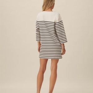 Inspired by classic French Breton stripe shirts, a relaxed boatneck shift dress with long sleeves, made from heavy cotton jersey. Detailed with herringbone tape along the side slits and neckline and finished with a garment wash for a soft, broken-in feel.
