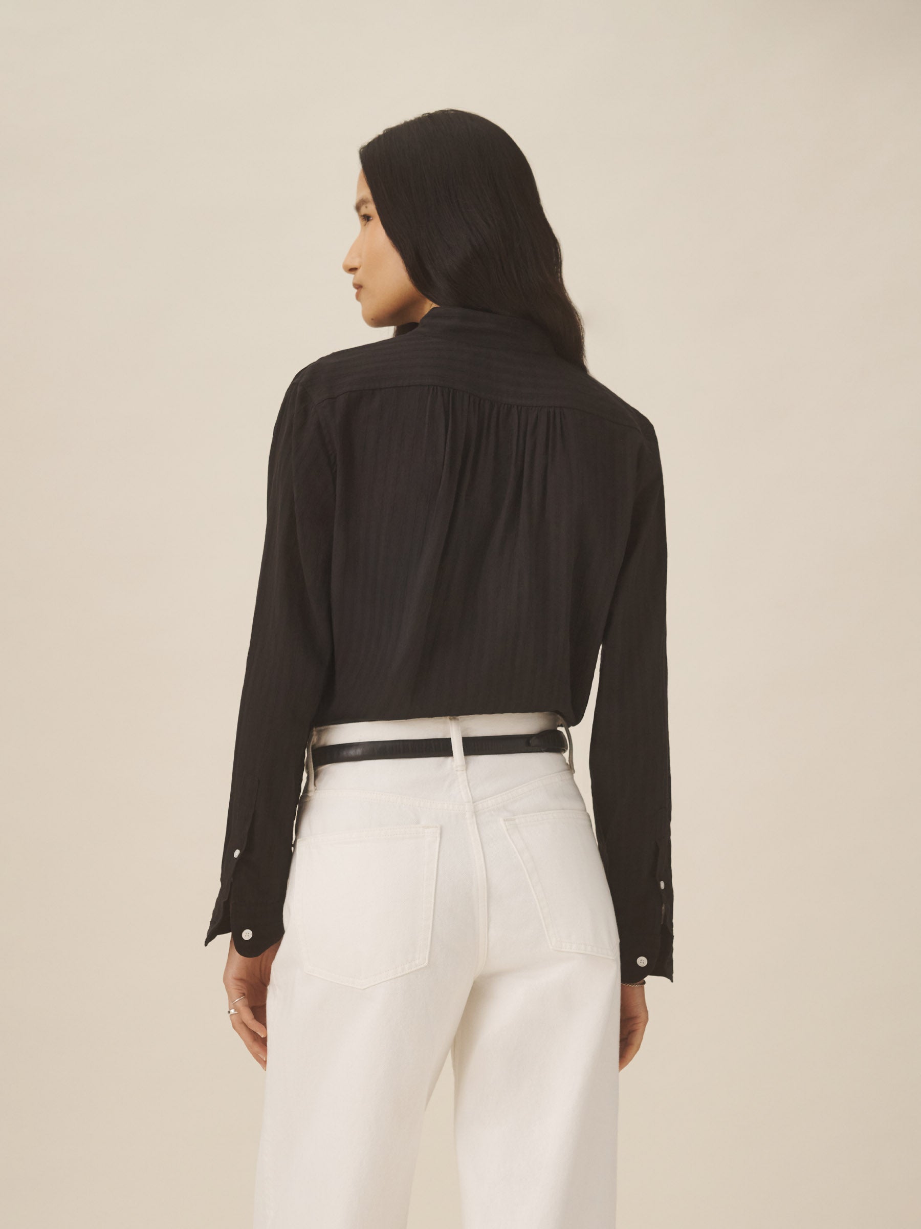 Relaxed-fit sheer shirt made from breathable 80-GSM cotton for a comfortable and airy feel. Featuring shirring at the shoulders and cuffs, a back yoke, and two chest pockets with button closures. Finished with mother of pearl buttons, button-through cuffs, and felled seams. Garment washed for a soft, worn-in feel.