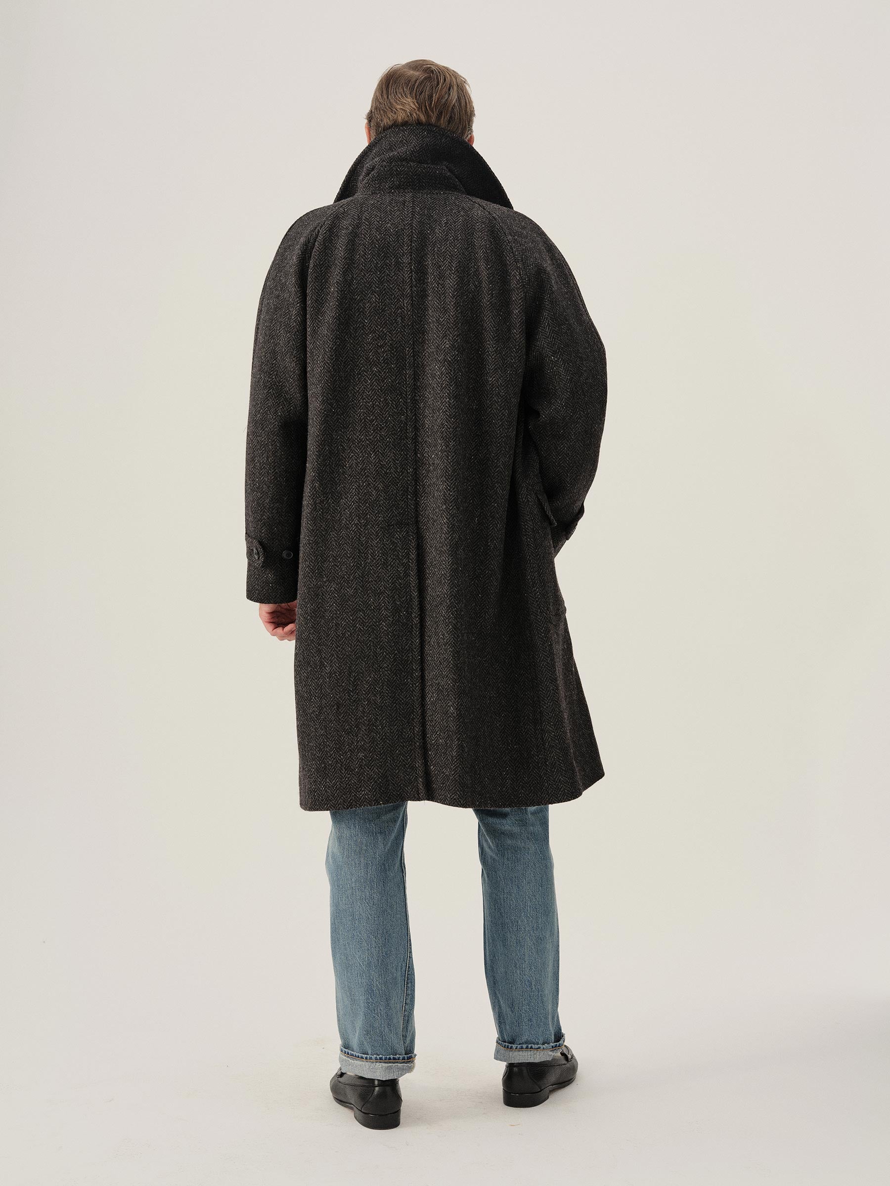 Raglan-sleeved overcoat inspired by WW2 military trench coats with full canvas construction in a classic fit designed for layering and engineered to fit a wide range of body types. This rich textured handwoven Donegal tweed is hearty and resilient, providing substantial warmth while remaining breathable and moisture-wicking. Details include full bemberg lining and genuine horn buttons, two patch-and-flap pockets at hip, two interior welt pockets, a button front closure, a button-through center back vent and buttoned sleeve tabs.