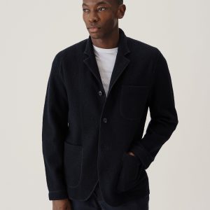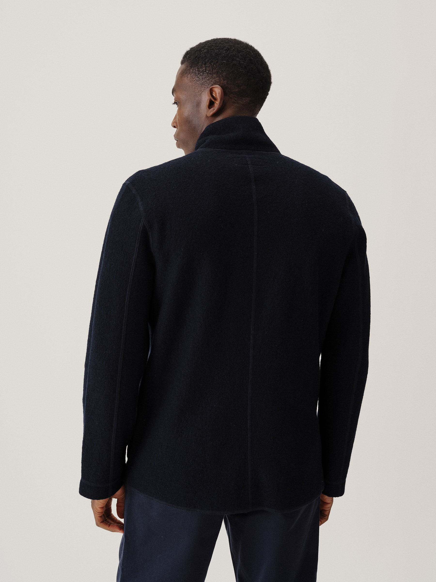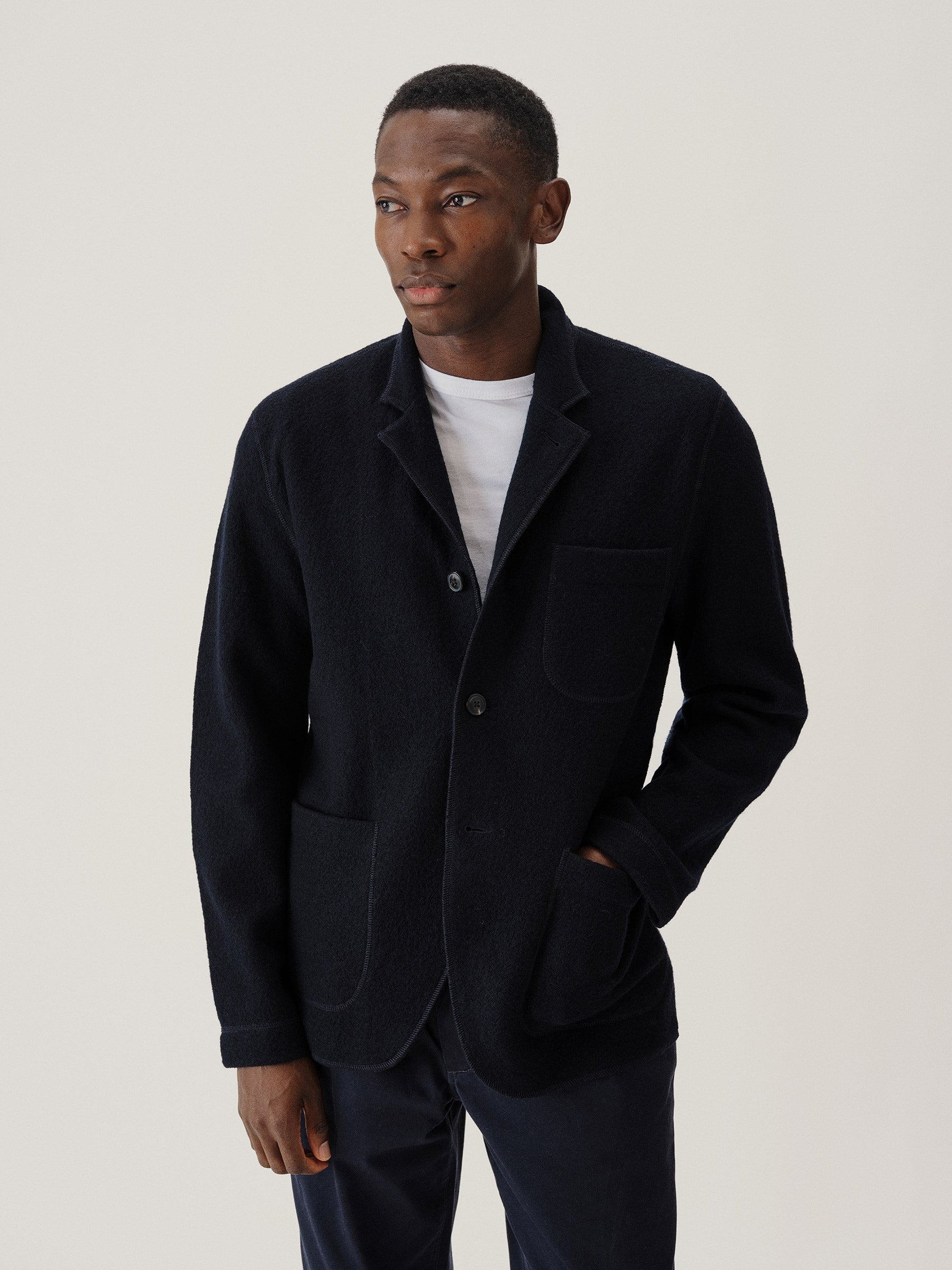 Classic fit chore coat with a slimmer cut through the arms and room in the torso for layering. This 340 GSM felted merino wool has been twice boiled for improved insulation and durability. Details include three patch pockets, real horn buttons, and a notch collar. Constructed with hand-sewn facings and cover-stitching throughout.