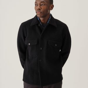 Classic fit field shirt in 340 GSM felted merino wool, twice boiled for improved insulation and durability. Details include patch-and-flap chest pockets and a button front closure. Constructed with hand-sewn facings and cover-stitching with flat seams for comfort.