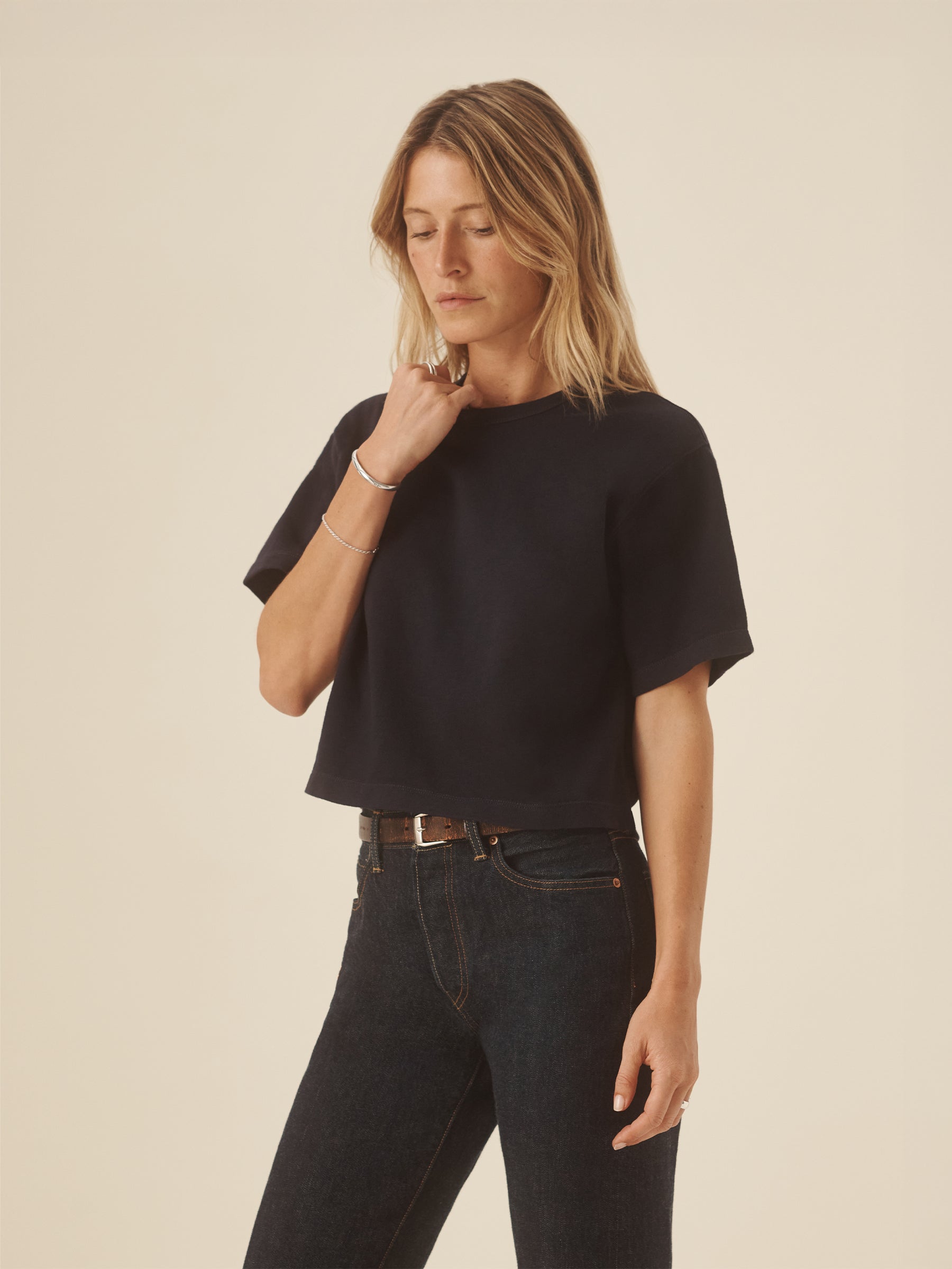 Cut from a heavyweight 310 GSM cotton, this slightly oversized, boxy crewneck tee has a straight hemline that hits right at your natural waist. Double-washed for a soft, smooth texture and consistent fit.
