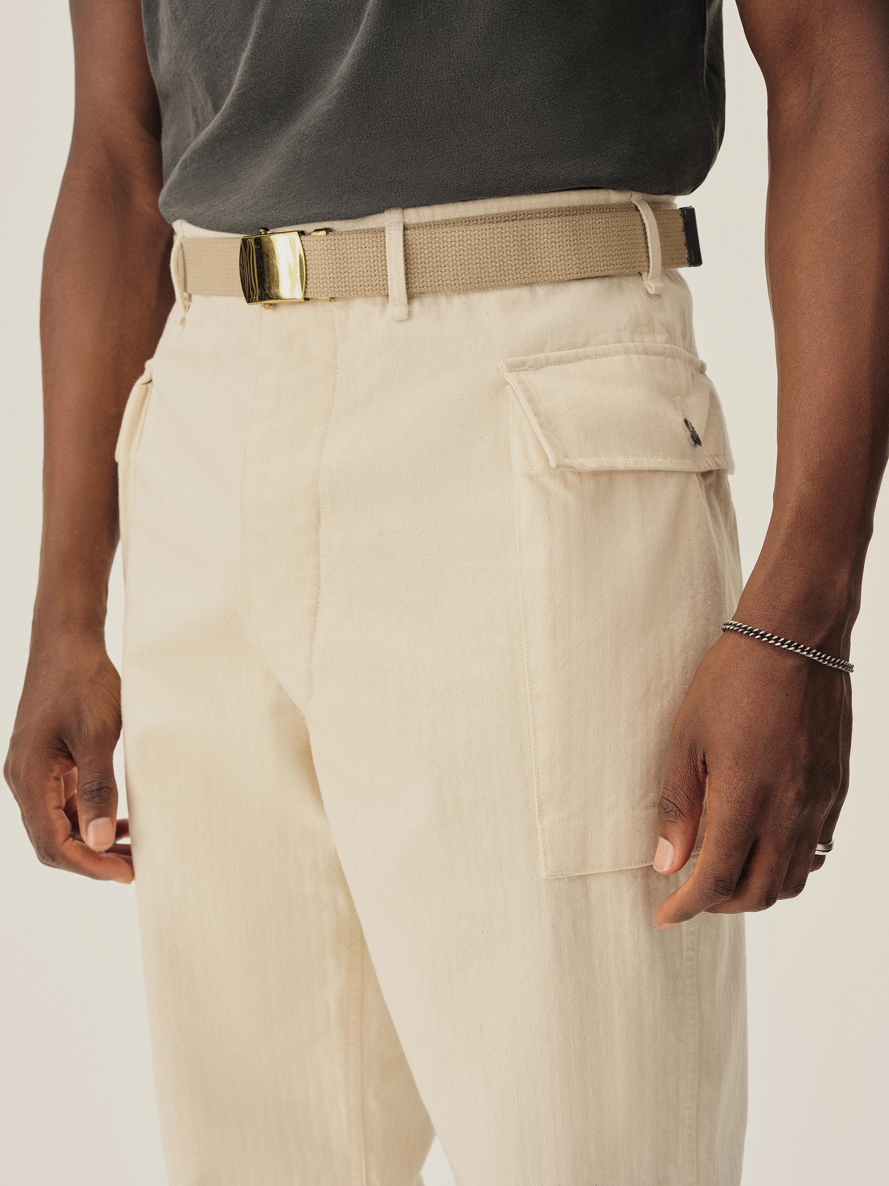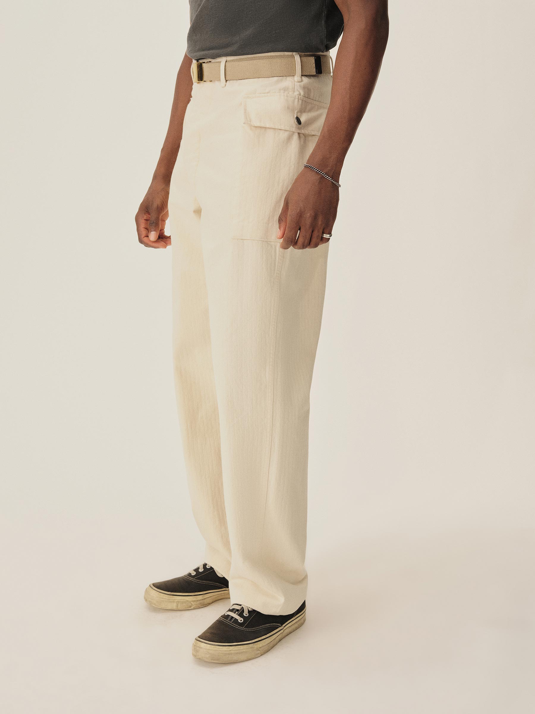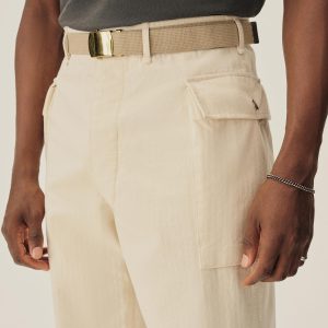 Inspired by the Herringbone Twill – or HBT – fatigue trousers worn by the US Army in WWII, these pants feature two cargo pockets high on the hips, close to the waistband. The pockets are made with an expandable gusset that allows them to keep a low profile while still being able to stow anything you need. The fit is relaxed with room in the leg and seat to accommodate the side pockets. The buttons are metal tack buttons featuring a 13-star design on the top – one for each of the original colonies.