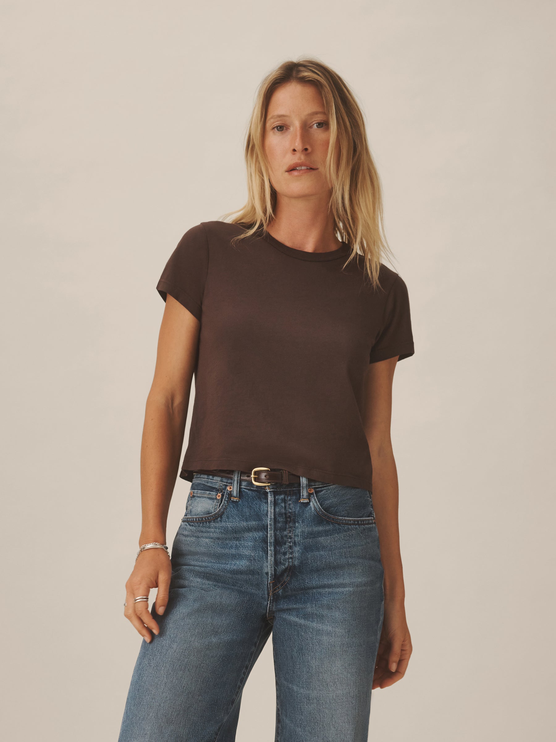 Boxy short sleeve crewneck tee with a straight hem. Cut from 120 GSM Supima cotton. Constructed with rib neck binding and double-needle cover-stitching at the hem. Garment washed for a lived-in feel.