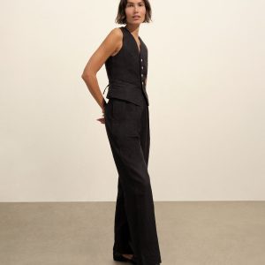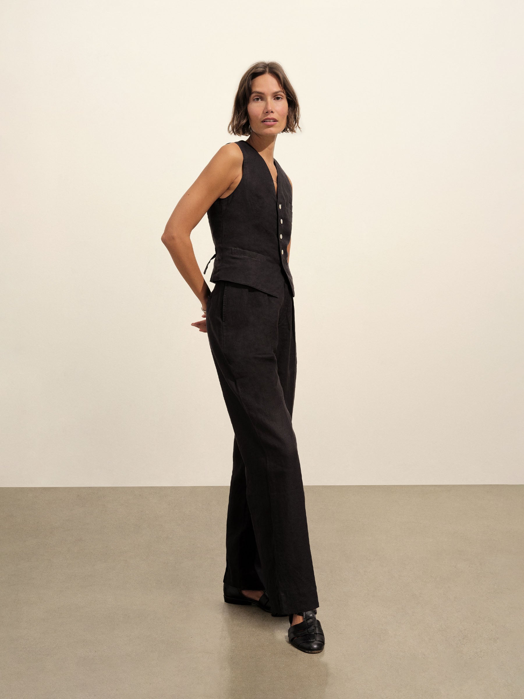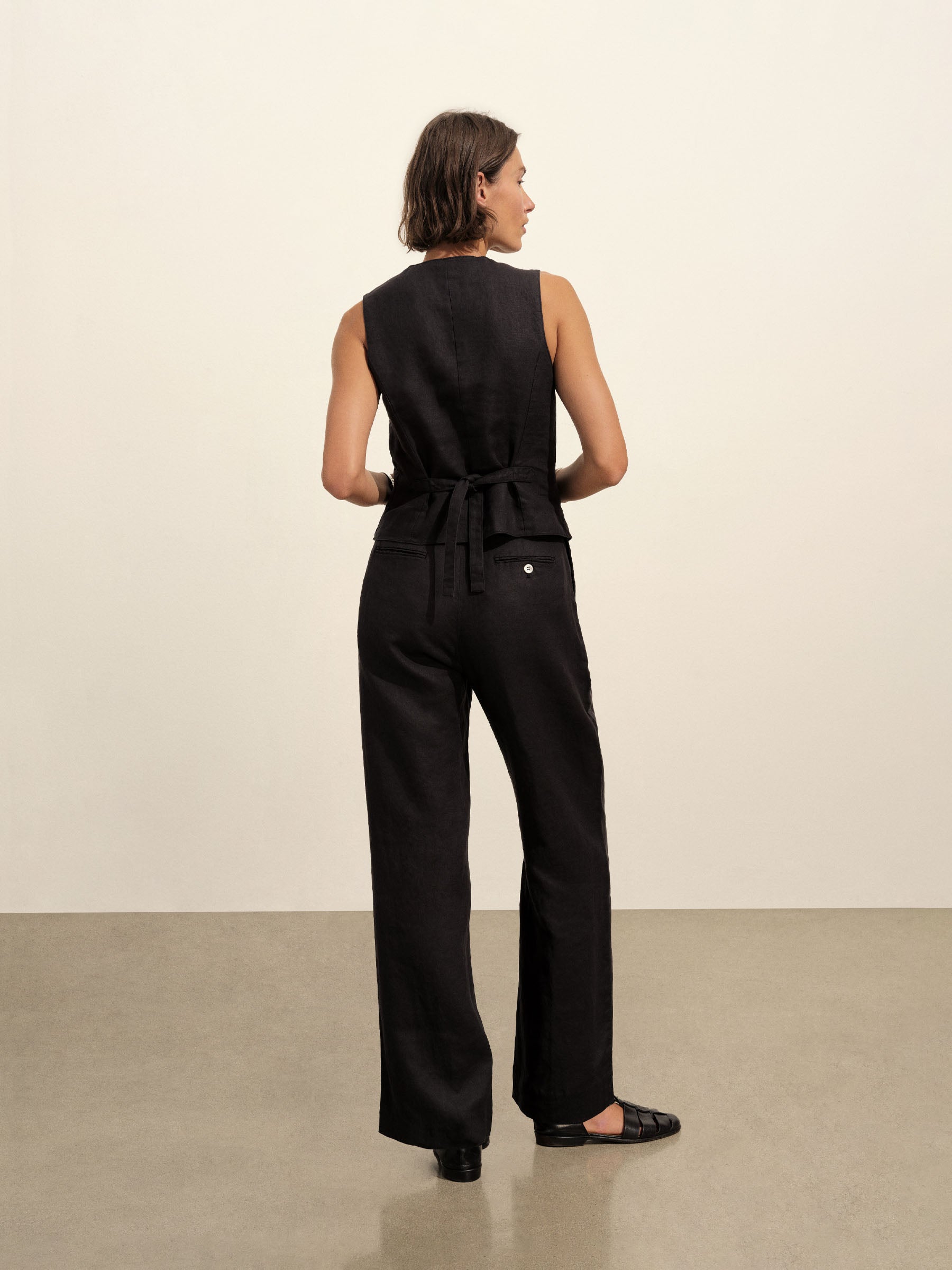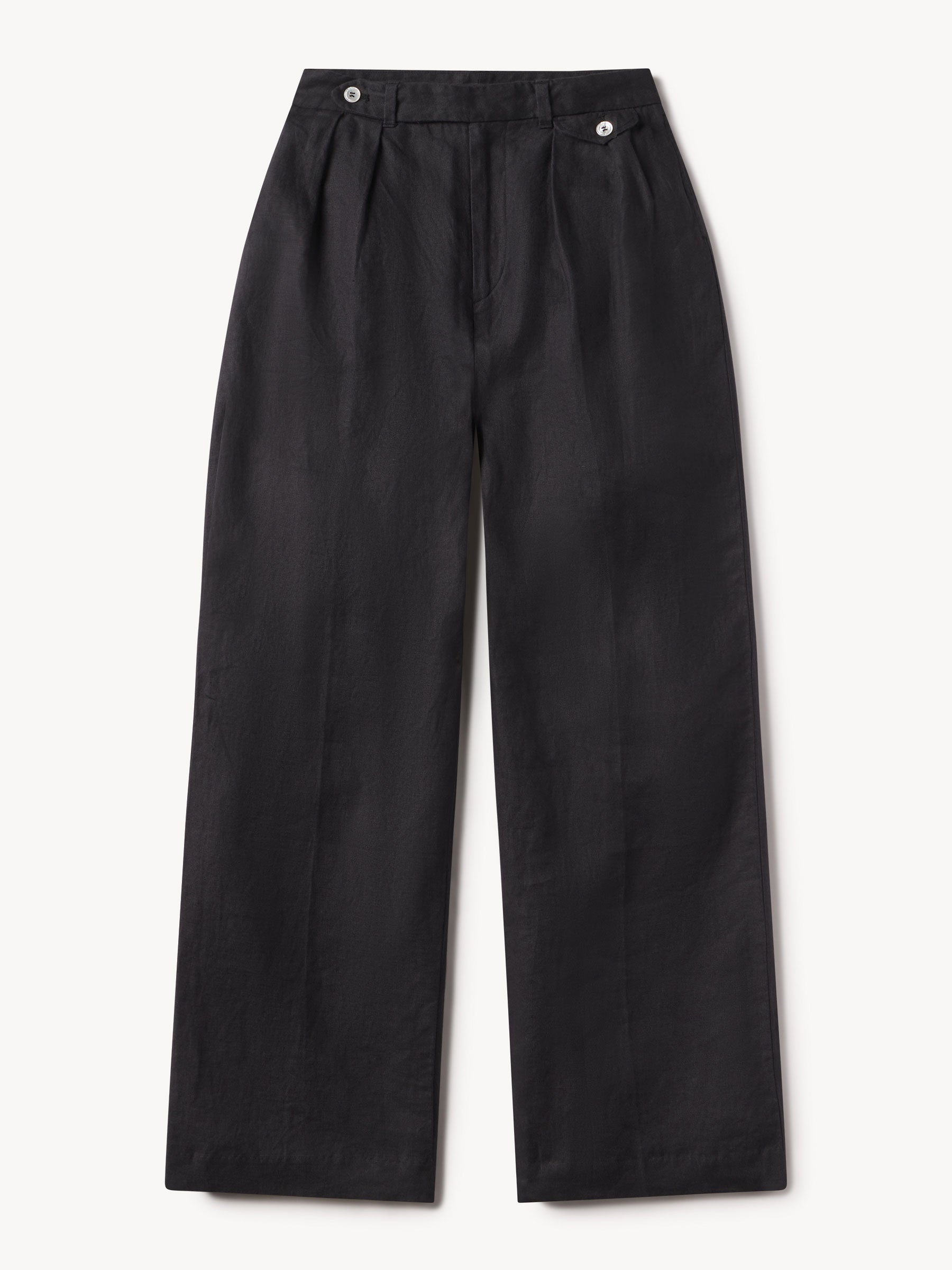 Taking inspiration from 1940s men’s tailoring, a pleated wide-leg trouser tailored for the modern woman, cut from 6.5 oz. linen. Featuring a 32.5” inseam with a mid-rise, a button-through waistband extension, a front coin pocket with button-through flap, and back welt pockets with a single button closure. Finished with mother of pearl buttons and a zipper fly. Garment washed for a truly vintage feel.