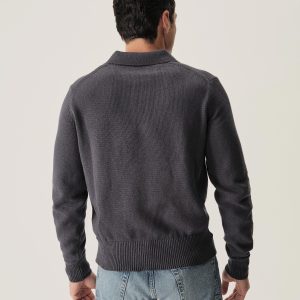 Classic fit polo sweater in a 7 gauge half cardigan rib knit from our homespun yarn-dyed cotton. Features a 3-button rib center front placket with nacre buttons and a rib collar designed to lay flat. Constructed with hand-linked seams and racking stitch detailing at the cuffs.