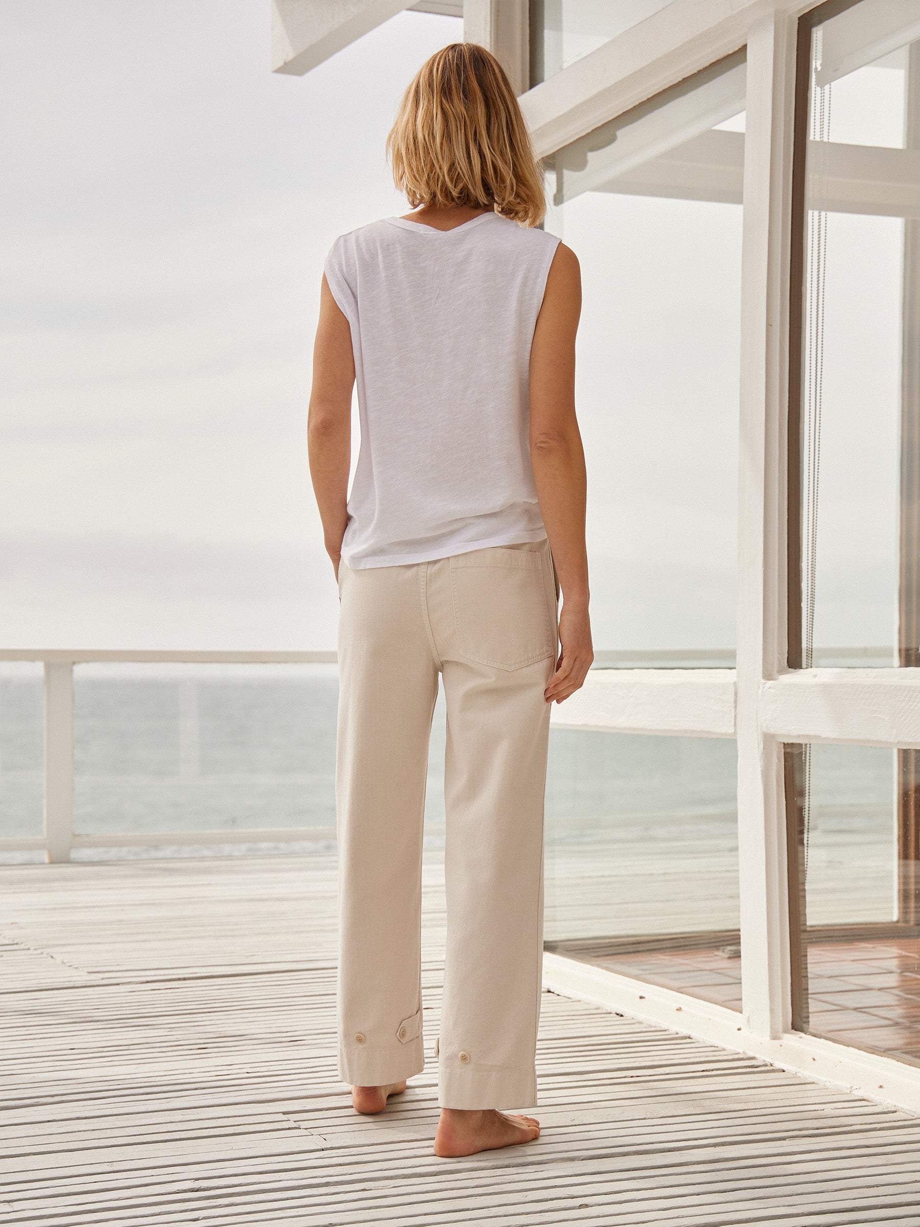 Relaxed muscle tank with a straight hem, cut from 125 GSM cotton with light slub texture. Modeled on a vintage men’s tee with the sleeves cut off. Knit in Los Angeles and washed for a lived-in feel.