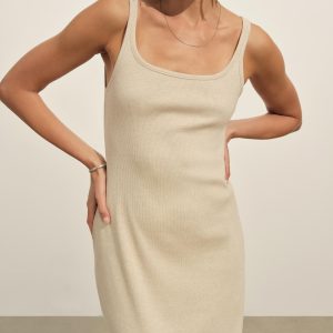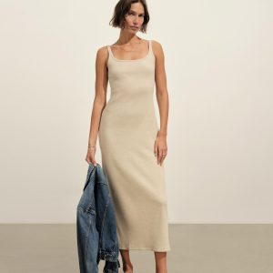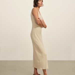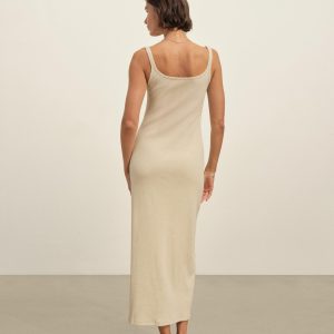 Slim fit ribbed scoop neck tank dress that’s fitted to the waist, then relaxes to hit below the calf in a 54” length. An easy, flattering silhouette in 295 GSM stretch cotton that holds its shape. 2×2 rib structure—two rows of rib stitch, two rows of jersey stitch—is offset by contrast 1×1 rib at the neck. Constructed with coverstitching throughout and flatlock stitching and godets at the side seams for extra volume. Garment washed for a lived-in feel.