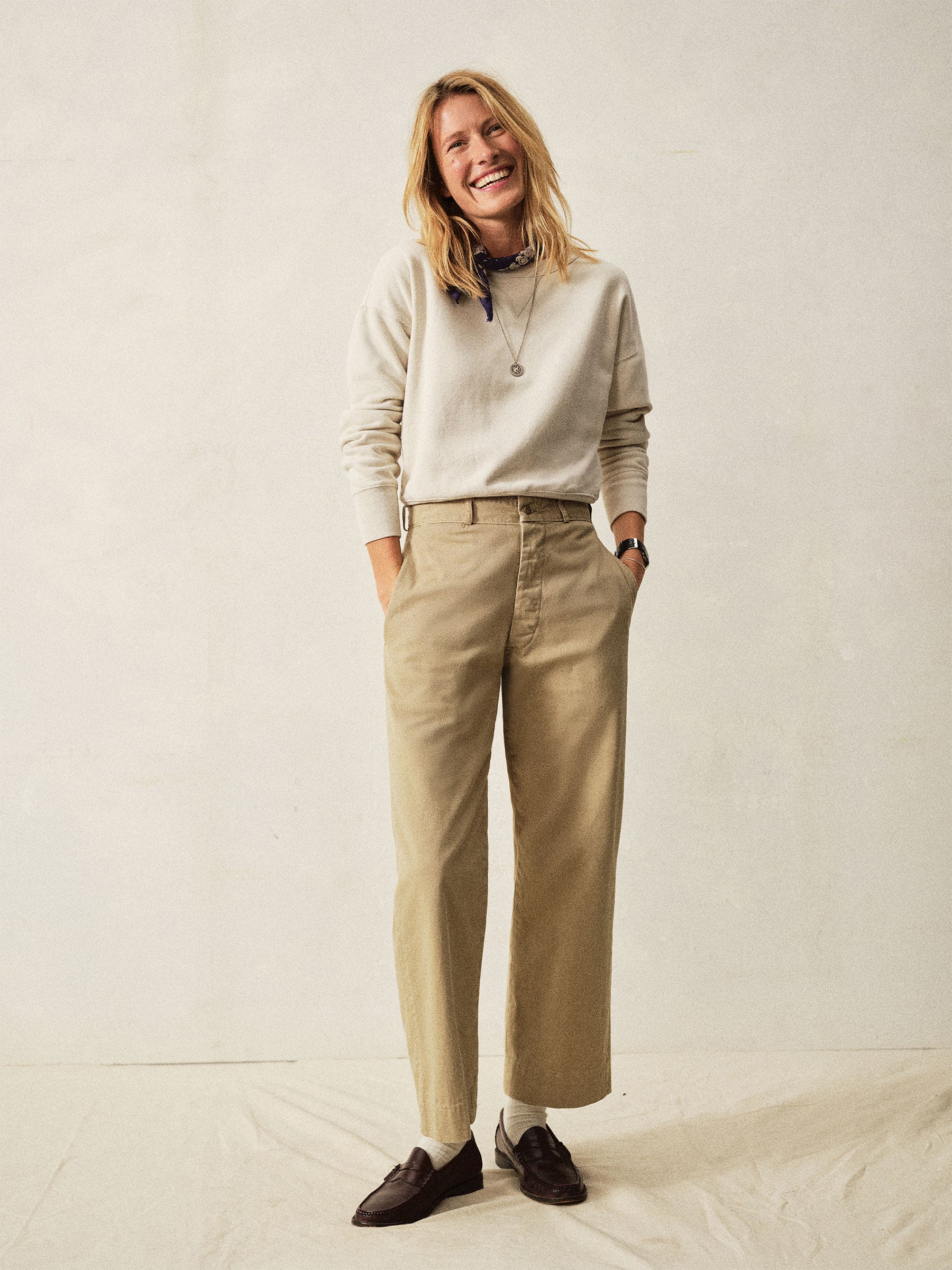 Relaxed crewneck sweatshirt in 290 GSM yarn-dyed cotton French terry with a semi-brushed back. Features a “Dorito” insert at the neckline for shape retention, drop shoulders, and 1×1 ribbing at the collar, cuffs, and waistband. Garment washed for a lived-in feel. Pair it with the Interloop Wide Leg Sweatpant or Gym Short to complete the look.