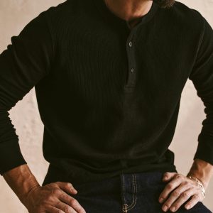 Classic fit thermal long sleeve henley with a straight hem. This 250 GSM French rib cotton double knit features a waffle-knit face and a smooth jersey back. Details include a woven three-button placket and corozo buttons. Constructed with ribbed cuffs and flat-lock stitching throughout for improved comfort and durability. Garment washed with enzymes and softener for a lived-in feel.