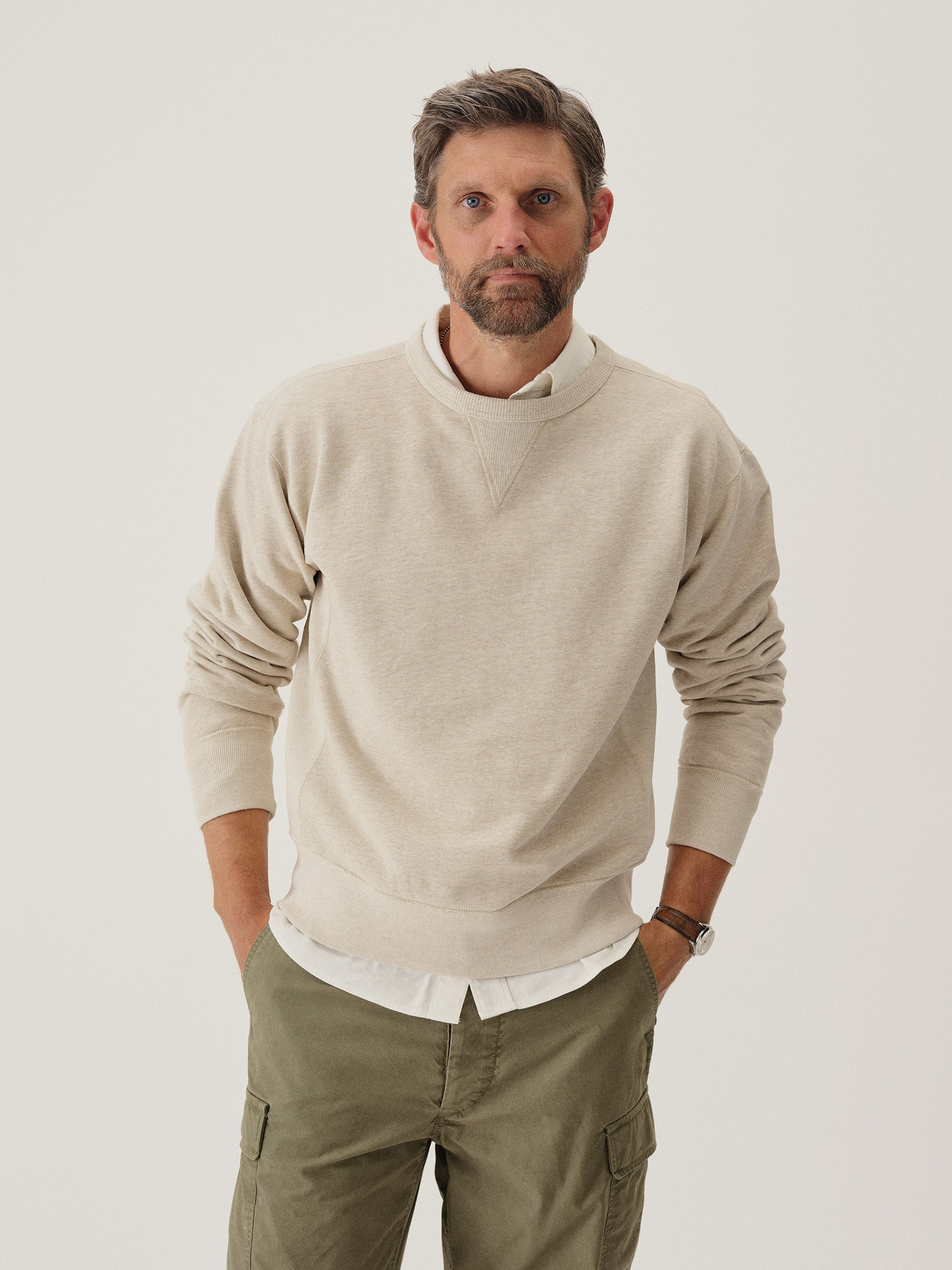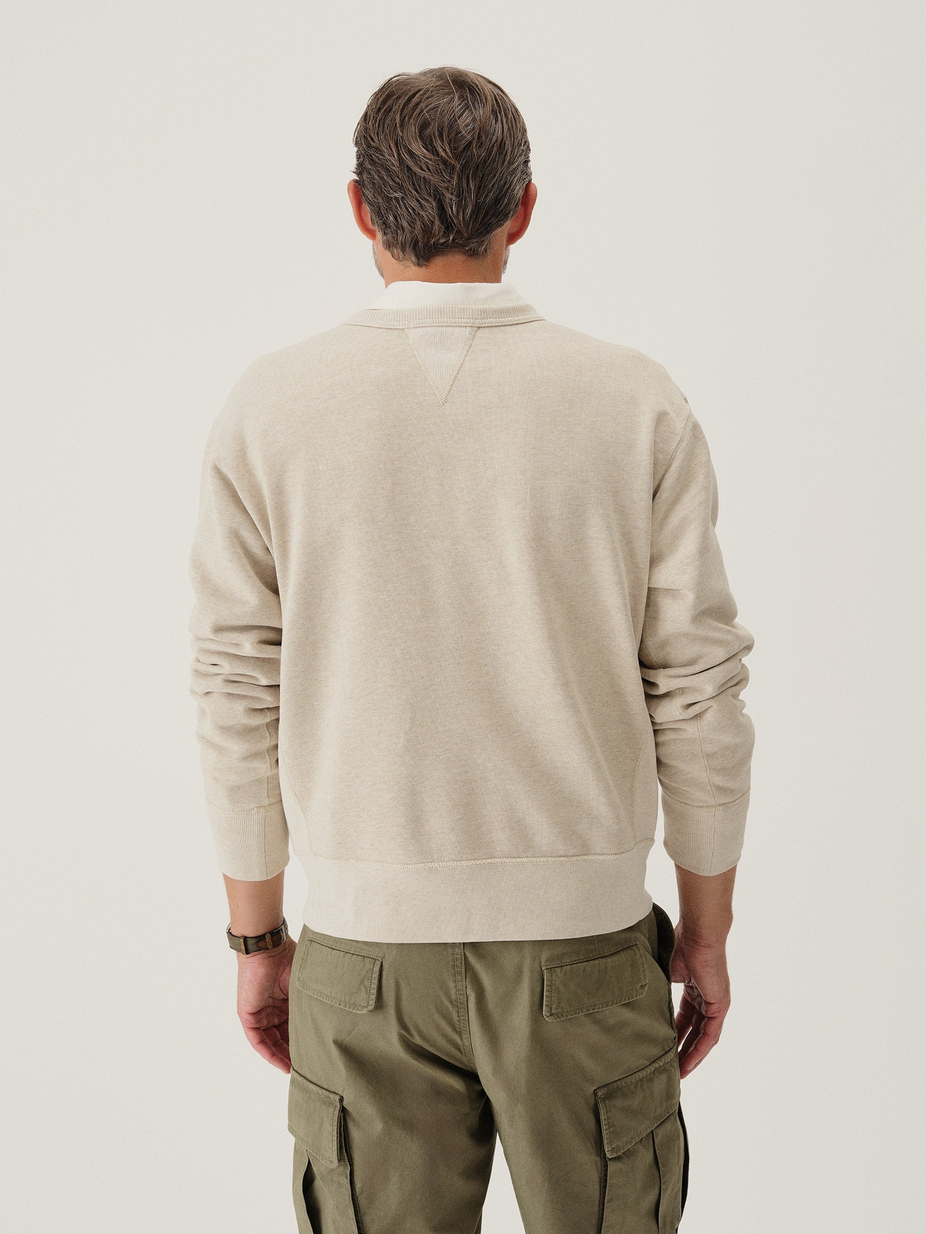 A midcentury-inspired crewneck sweatshirt made from plush, not-too-heavy, not-too-light, welterweight French terry. Features a “V” detailing at the front and back neck opening that was commonly found on sweatshirts from the 1940s and 50s.